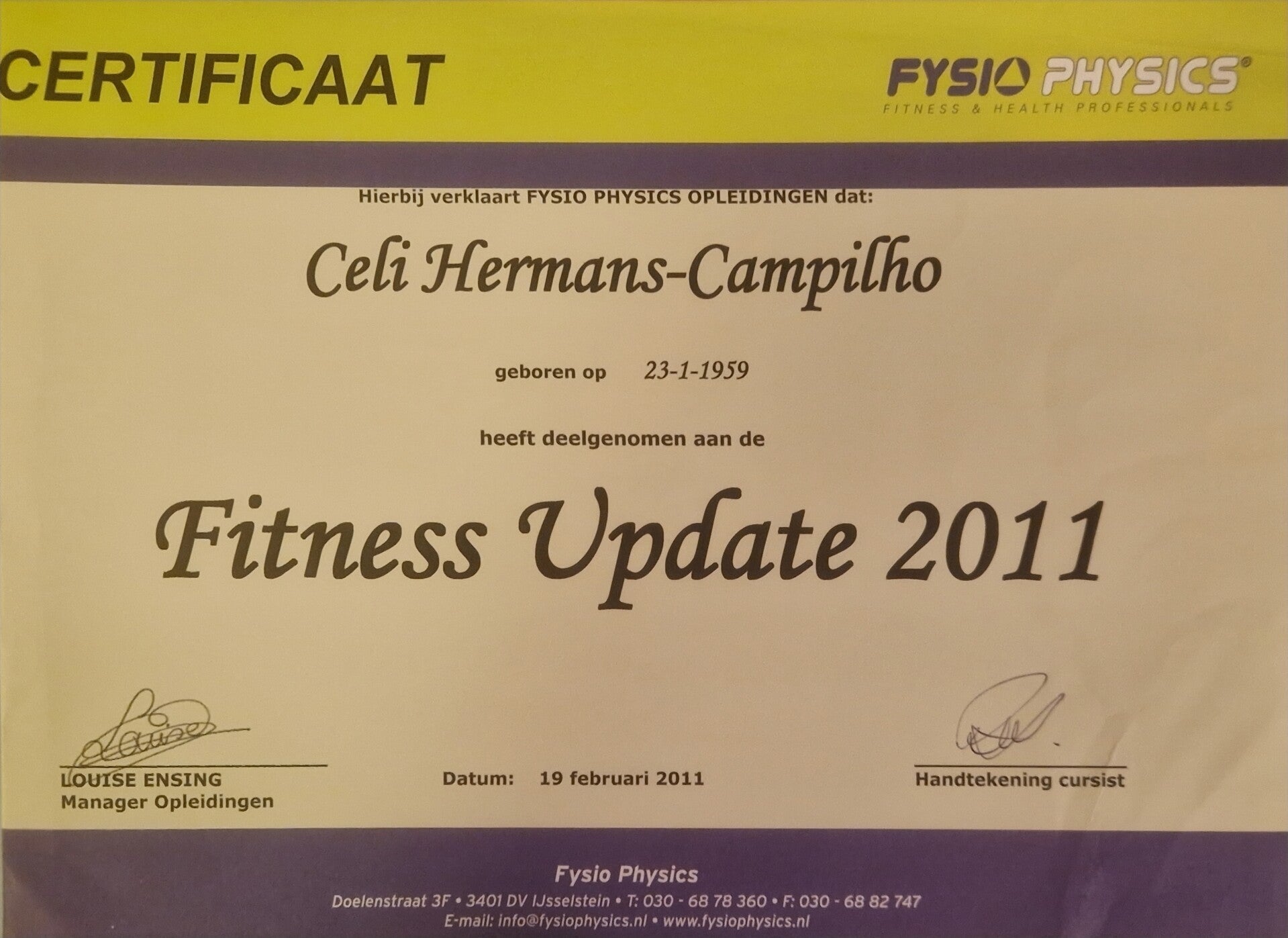 Na Holanda estudei Ciências da Educação na Universidade de Utrecht para validar meu diploma e ao mesmo tempo me tornei professora de Ginástica. Coincidentemente, acabei na indústria do esporte e nunca mais larguei. Da Educação Cognitiva à Educação Física. Descobri que os dois andam juntos… Comecei como instrutora de Aeróbica e logo fui seguindo um curso após o outro: Aeróbica, Step, Bodyshape, Fitness e finalmente Medical Fitness! Meu primeiro contato com a Zumba foi em 2009 quando Beto Perez (o criador da Zumba) veio para a Holanda. Foi uma loucura e desde então não saio do mundo da Zumba. Foram muitas especializações: Depois do Zumba Fitness com Beto, veio o Zumba Fitness 2 e o Zumba Toning (com pesos). Mais tarde vieram Zumba Step, Zumba Gold (Senior), Zumba Kids e Aqua Zumba! Agora adicionei Strong Nation(HITT) e o mais recente Circl Mobility (flexibilidade). Como bônus, tive Zumba Core, Zumba Glúteos, Zumba Brasil, Zumba Caribe, Zumba Índia e Zumba África. Um mais divertido que o outro, tudo é sempre muito divertido na Zumba! Hoje em dia estou focada principalmente em Zumba Fitness, Zumba Toning, Zumba Gold, Strong 30, Circl Mobility e BBB Workout (Localizada bumbum, pernas e abdômem ), que também inclue treino de fitness, step e treinamento de intervalo. No verão, o Outdoor Boost (Caminhada na floresta): 5 km + exercícios localizados. Incrível também!